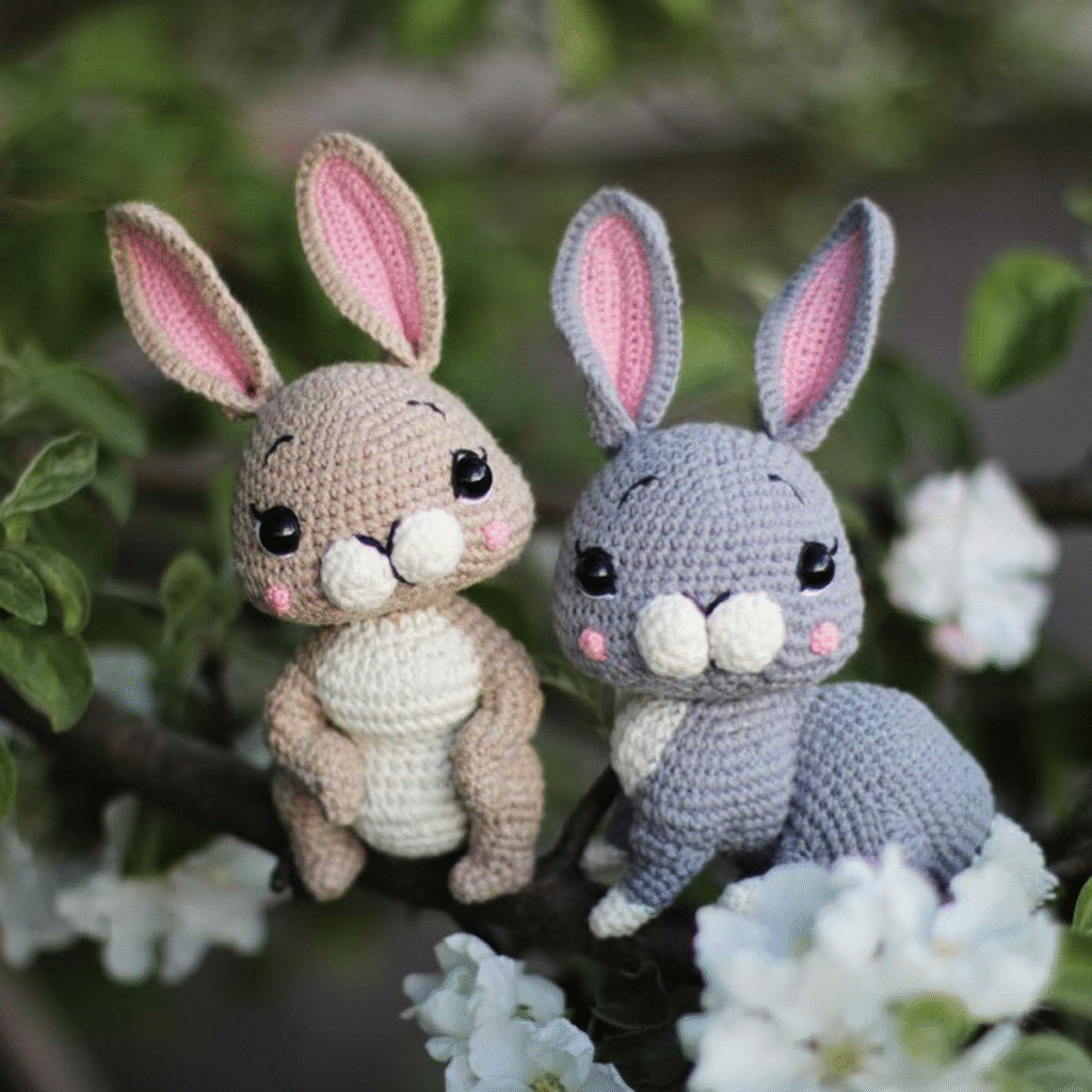 O coelhinho é outro amigurumi fácil e muito charmoso. Ele combina o ponto baixo com pequenas alterações para modelar orelhas alongadas e corpo cilíndrico. Use fios claros e agulhas médias, o que facilita o controle do ponto. Preencha o corpo gradualmente para manter a forma correta. Depois de pronto, você pode adicionar detalhes como um laço no pescoço ou bordar o rosto para dar personalidade à peça. Este projeto ajuda a aprender proporções e técnicas básicas de montagem.