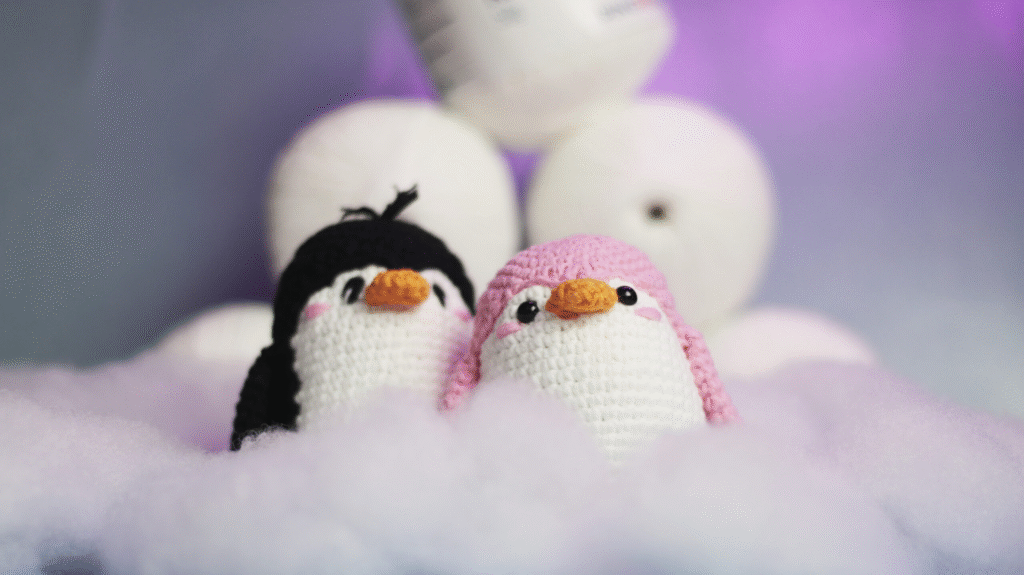 O pinguim é divertido e fácil de fazer. Seu corpo cilíndrico, barriga em cor contrastante e pequenas asas são confeccionados em ponto baixo, sem técnicas complexas. A cabeça e o corpo podem ser feitos juntos ou separados. Os olhos e o bico podem ser bordados ou adicionados com olhos de segurança. Esse modelo ajuda a praticar a troca de cores e a costura de partes distintas, habilidades importantes para avançar para amigurumis mais elaborados.